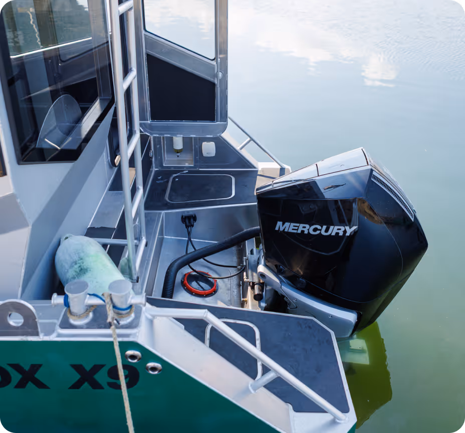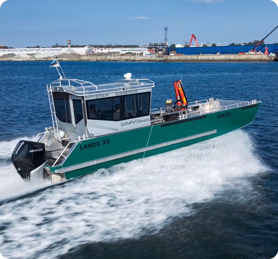 Rescue workboat for fast loading of equipment from the bow ramp.